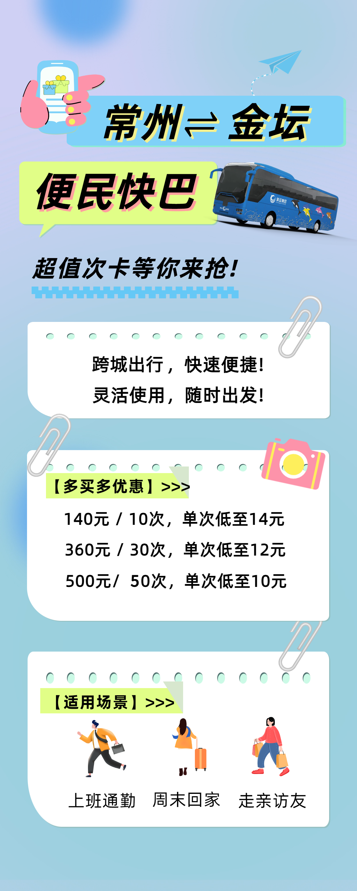 為進(jìn)一步提升出行體驗,常州至金壇便民快巴近日推出超值次卡,為廣大市民提供更加優(yōu)惠、便捷的出行選擇。此次推出的次卡共分為三檔:140元10次、360元30次、500元50次,具體購買及使用方式可關(guān)注“常州汽車站”公眾號了解詳情。